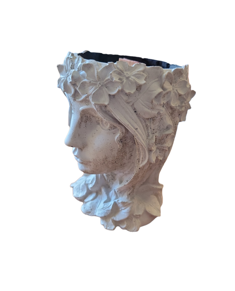 One hand poured and sealed concrete vessel in the form of a fae, woman, garden, gothic style.