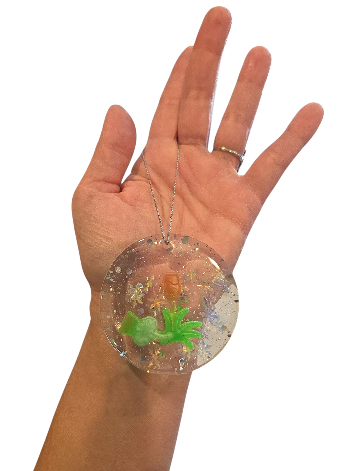 Bring a little mischievous holiday cheer to your tree with these handmade resin Grinch-inspired ornaments. Each ornament is crafted with care and sprinkled with glittering snowflakes for that perfect winter sparkle. Choose from three styles: