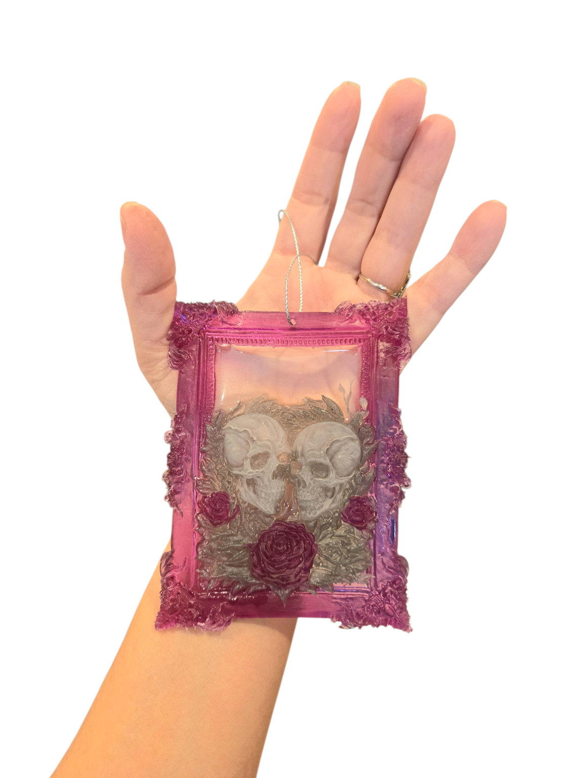 Celebrate a love that transcends time with this handmade large skeleton ornament couple, locked in an eternal embrace. Surrounded by deep purple roses and framed in intricate gothic filigree, this piece is a hauntingly beautiful window into an undead love story.