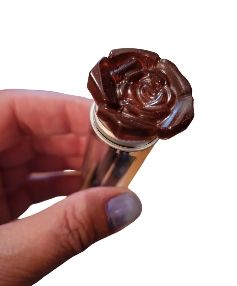 Glass cylinder filled with six artisan 2" matches. Striking sticker for lighting, located on bottom of glass. The top of lid is adorned with a hand poured blood red resin rose.