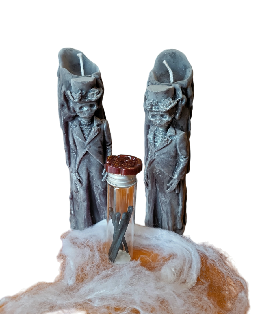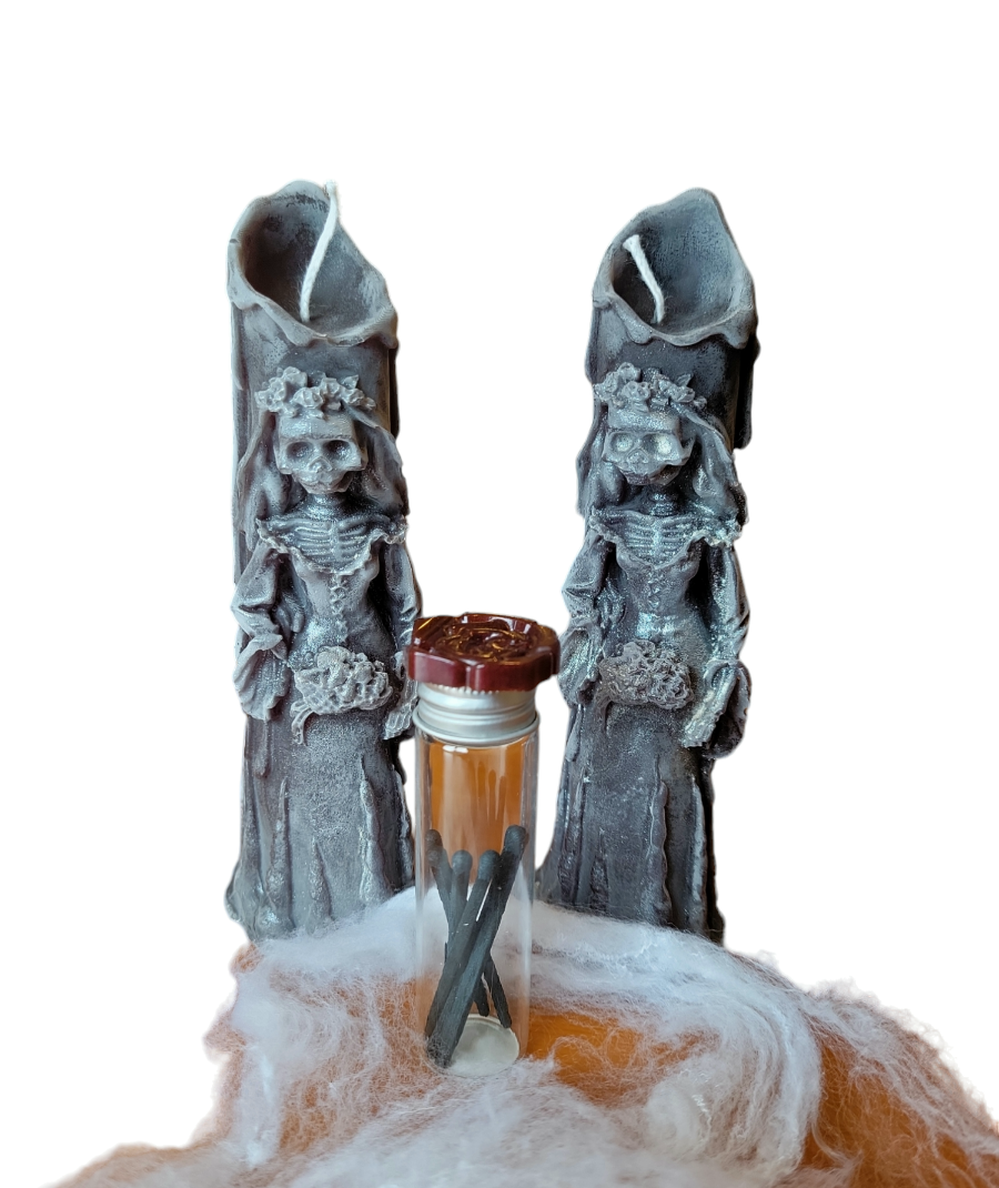 Gothic and timeless pair of skeleton candles that will not be separated. In this or the after-life. Great as wedding, gothic, or Halloween decor.