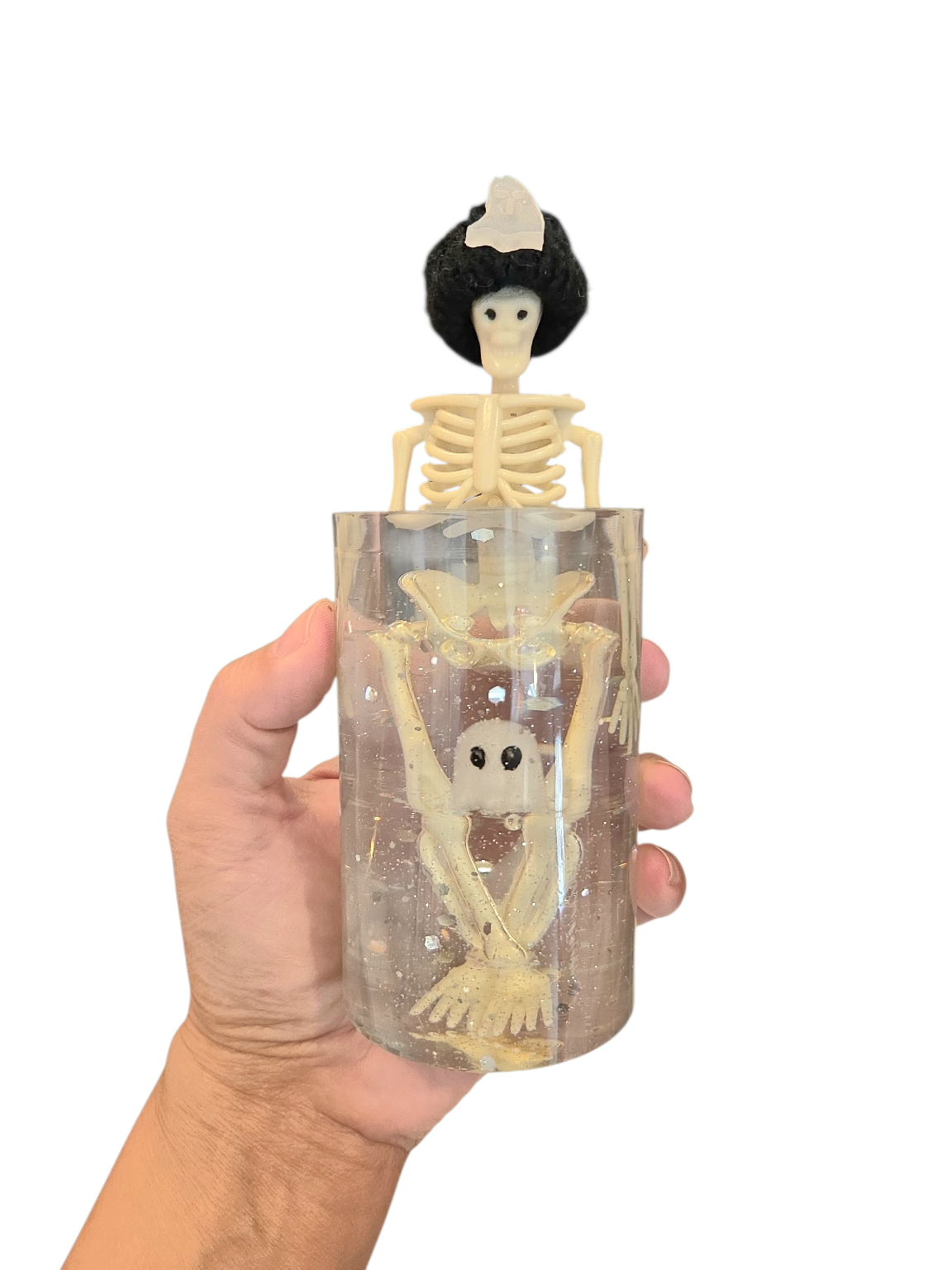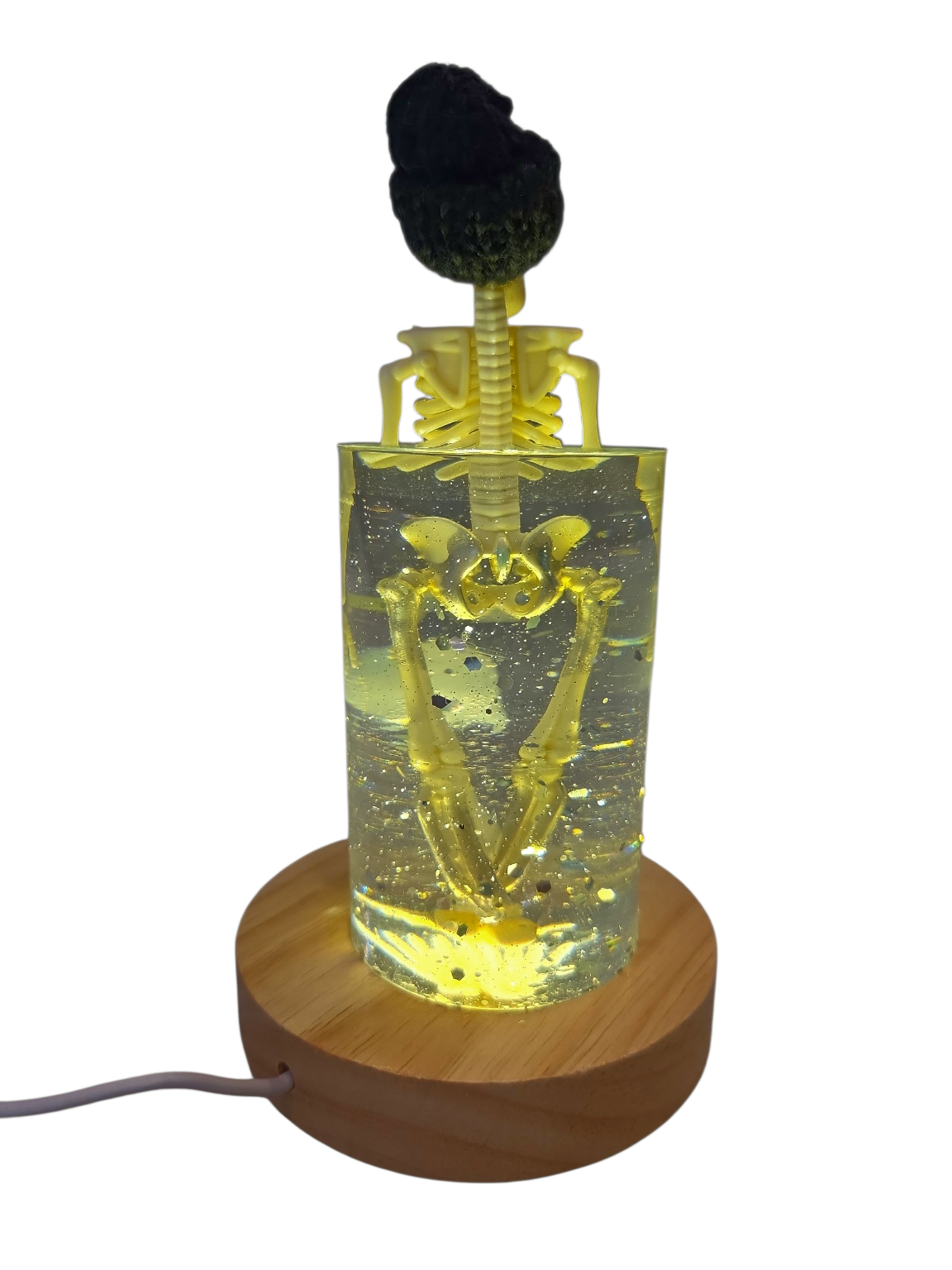Add a touch of spooky charm to your space with this one-of-a-kind handmade resin night light. Floating gracefully in a shimmering pool of glitter-infused resin, a laid-back skeleton stands ballerina-style with legs crossed—radiating equal parts eerie and elegance. Perched on its head is a cozy beanie featuring an adorable ghost, while a second tiny ghost floats nearby—perhaps a loyal pet or companion?